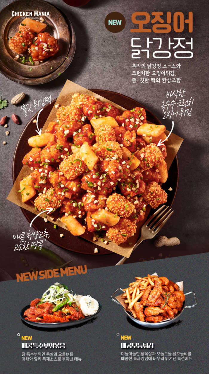 치킨매니아가 지난 30일 신메뉴 오징어 닭강정과 닭의 특수부위로 즐길수있는 사이드메뉴 2종을 새롭게 출시 했다.