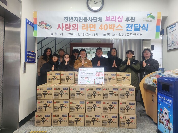 김재영 갈현1동장은 “춥고 어려운 시기에 라면을 기부를 해주신 청년봉사단체 보리심에 감사드린다”며 나눔문화 확산을 통해 훈훈한 정이 넘치는 지역사회를 만들도록 노력하며 꼭 필요한 가정에 전달되도록 하겠다“고 말했다.