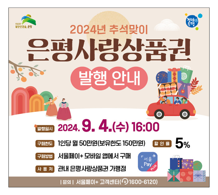[시민일보 = 이대우 기자] 은평구(구청장 김미경)가 추석 명절을 맞아 은평사랑상품권을 오는 9월4일 오후 4시부터 5% 할인된 금액으로 총 80억원을 판매한다.