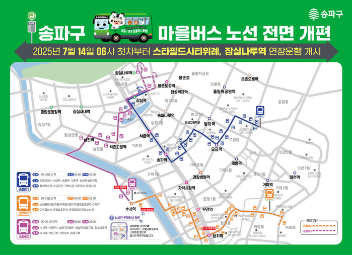 [시민일보 = 이대우 기자] 서울 송파구(구청장 서강석)가 오는 14일 오전 6시부터 마을버스 02번·03번 노선을 연장하고 차량을 늘려 운행한다고 7일 밝혔다.