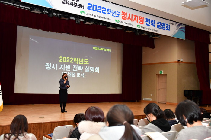 서울 중랑구는 24일 대입 수험생·학부모를 대상으로 ‘2022학년도 대입 정시 지원 전략 설명회’를 개최했다. 이번 설명회는 EBS 입시설명회 대표강사인 정제원 숭의여고 교사가 수능 가채점을 토대로 대학별 정시 지원전략 등을 주제로 진행했다. 사진은 설명회가 진행되고 있는 모습. (사진제공=중랑구청)