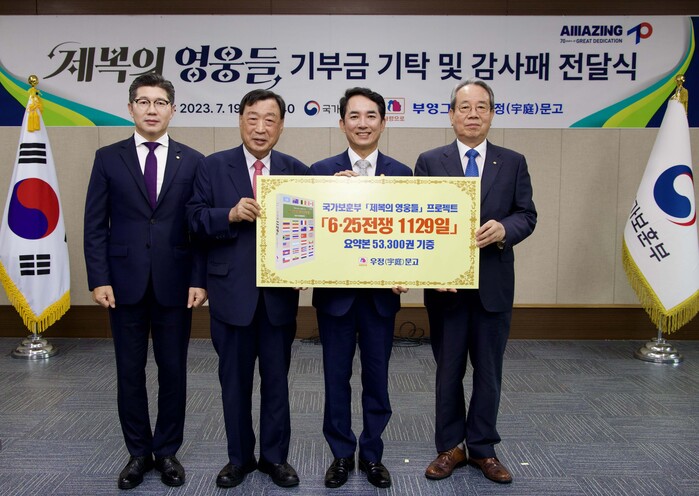 | ▲ (왼쪽부터) 부영그룹 박현순 전무, 부영그룹 이희범 회장, 박민식 국가보훈부 장관, 부영그룹 최양환 대표이사가 기증식 행사 후 기념촬영을 하고 있다.(사진=부영그룹 제공) |