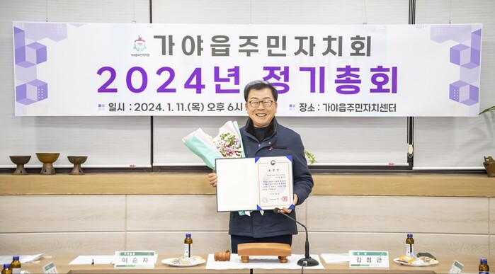 김회장은 2016년 가야읍 주민자치위원회 위원으로 주민자치에 발을 디뎠고 주민자치회 전환 이후 제1기, 제2기 주민자치회장 재임 4년여간 주민자치회 활성화와 참여예산 공모를 통한 주민불편사업 해결에 기여했다.