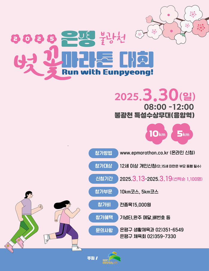 [시민일보 = 이대우 기자] 은평구(구청장 김미경)가 불광천변에서 오는 30일 ‘2025 은평 불광천 벚꽃 마라톤대회’를 개최한다.