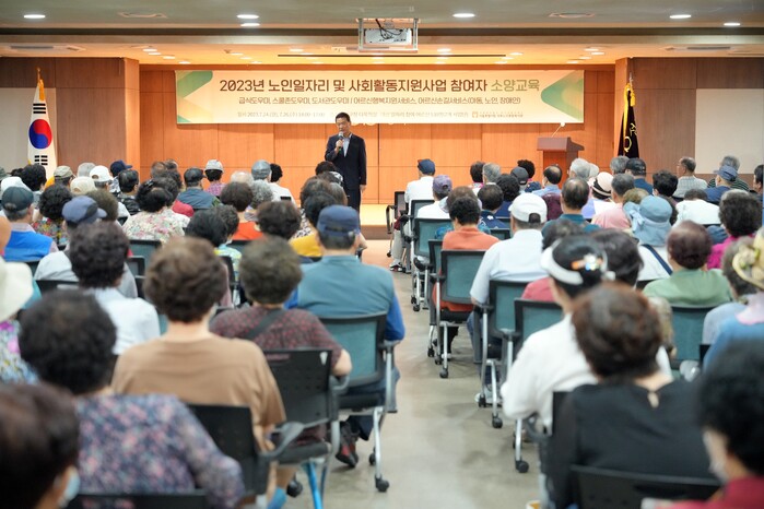 | ▲ 이승로 구청장이 노인 관련 행사에 참석해 폭염 대비 안전에 대한 강의를 하고 있다. (사진=성북구청 제공) |