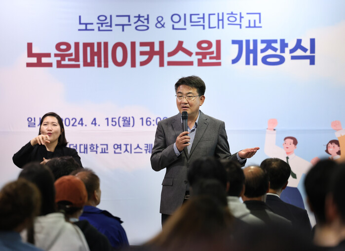 | ▲ 오승록 노원구청장이 15일 오후 4시 서울 노원구 소재 인덕대학교 연지스퀘어에서 열린 ‘노원메이커스원 개장식’에 참석해 인사말을 하고 있다. (사진=노원구청 제공) |