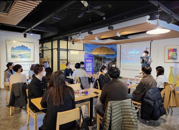 행사는 지역내 청년 갤러리카페 중 한 곳인 ‘커피라운지55’에서 진행했다. 청년 지원 사업에 계속해서 참여해온 서초 청년네트워크 청년 및 관계자 15명이 참석하여 성과를 서로 공유하는 시간을 갖고, 실시간 온라인 중계를 통해 행사 현장에 참여하지 못하는 청년들도 함께할 수 있도록 했다.