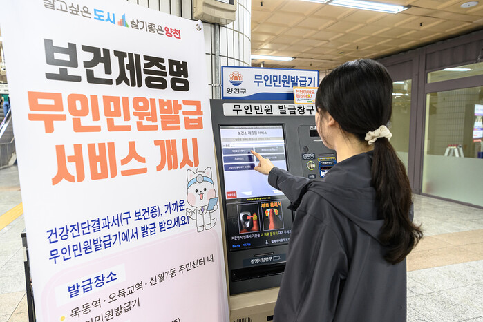 [시민일보 = 이대우 기자] 양천구(구청장 이기재)가 구민 편의 증진을 위해 ‘보건제증명 무인민원 발급 서비스’를 시작한다.