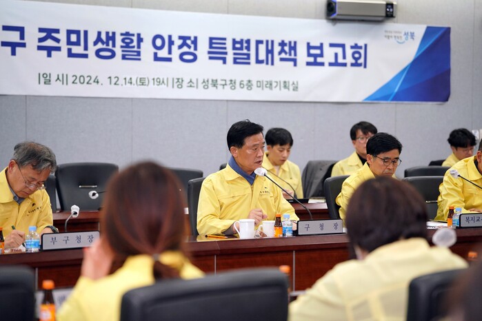 [시민일보 = 문민호 기자] 지난 14일 대통령 탄핵안이 가결됨에 따라 이승로 성북구청장은 간부 비상 회의를 열고 “성북구 공직자 모두가 어떠한 상황에서도 성북구민의 일상 유지와 안전을 최우선으로 한 치의 흔들림 없이 업무에 최선을 다할 것”을 강조했다.