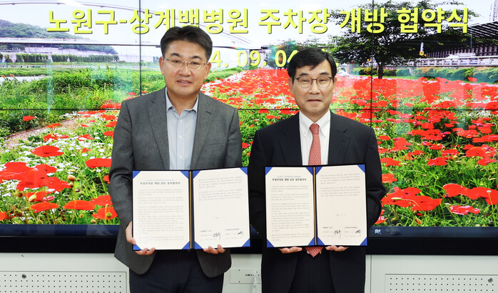 서울 노원구는 4일 인제대학교 상계백병원과 부설주차장 개방 협약을 맺고 상계백병원은 병원 지하 2층 주차장 50면을 지역 주민들에게 개방한다. 사진은 협약식에서 오승록 구청장(왼쪽)과 관계자가 기념촬영을 하고 있는 모습. (사진=노원구청 제공)