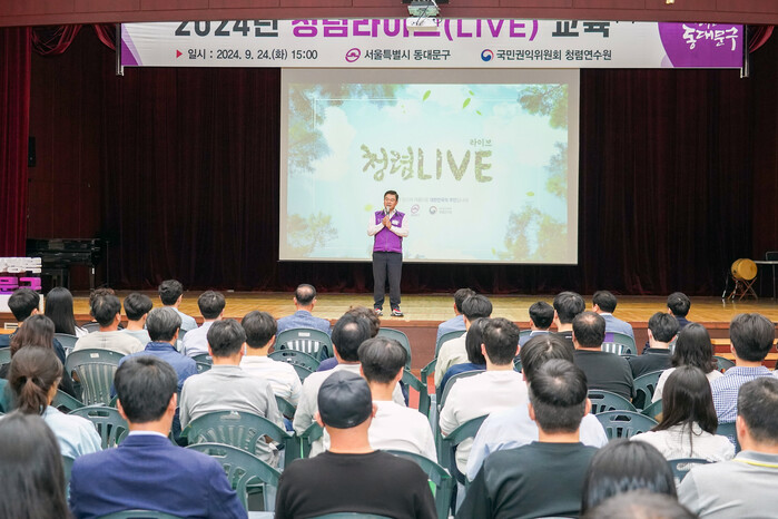 [시민일보 = 이대우 기자] 서울 동대문구(구청장 이필형)는 지난 24일 구청 강당에서 구 직원 및 동대문구 시설관리공단 직원 500여 명을 대상으로 청렴행정에 대한 이해를 높이기 위한 ‘청렴라이브(LIVE)’ 교육을 진행했다고 밝혔다.