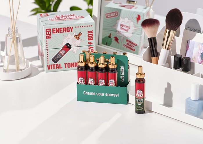 '정관장 활기력 에너지박스'는 6년근 홍삼농축액에 생강, 대추, 구기자 등 전통소재와 비타민 B, C를 배합한 앰플형 건강 드링크 ‘정관장 활기력(20㎖)’을 20병으로 리패키징한 카카오톡 선물하기 전용 제품이다.