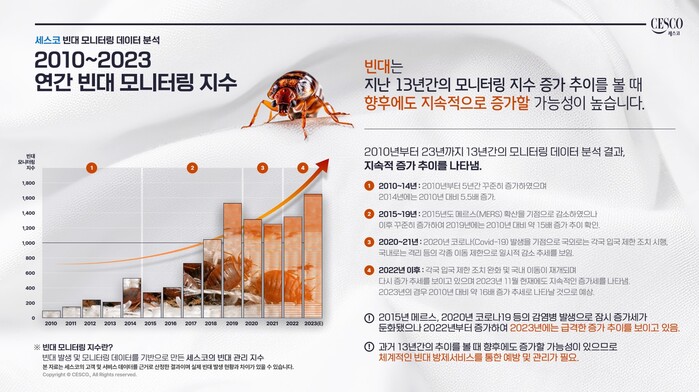 2010년 전후로 미국 등 해외에서 빈대 발생이 급증함에 따라 빈대 관련 국내 사례와 데이터를 축적 관리해온 세스코는 2010년을 기점으로 올해 11월까지 13년간의 ‘빈대모니터링지수’를 데이터화하여 공개하기도 했다.