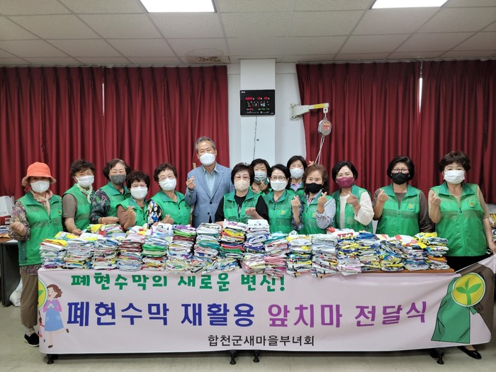 재활용센터는 각종 행사 및 홍보 시 발생되는 현수막을 부녀회원들이 수집하여 지난 4월부터 13차례에 걸쳐 회원들의 재능기부 봉사활동으로 지퍼 달린 농촌 수확용 앞치마를 600개 제작하였으며, 읍면 부녀회장을 통해 읍면의 농가(고추, 밤, 고사리 농가 등)에 전달 될 예정이다.