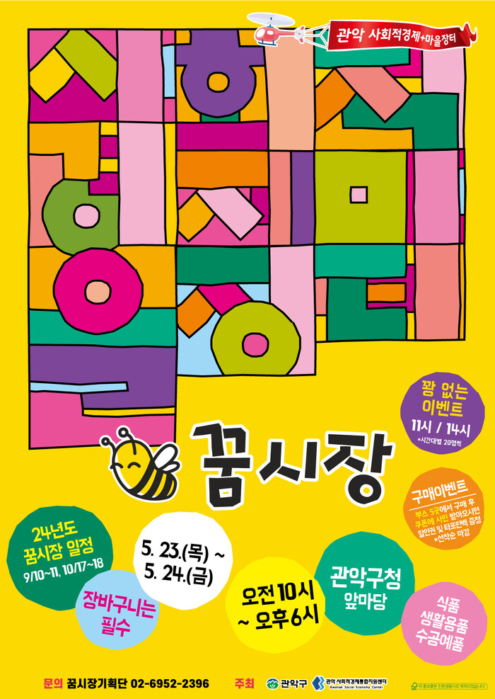 [시민일보 = 여영준 기자] 관악구(구청장 박준희)는 주민들에게 큰 인기몰이 중인 사회적경제장터 ‘꿈시장’을 오는 23~24일 양일 간 관악구청 광장에서 개장한다고 밝혔다.