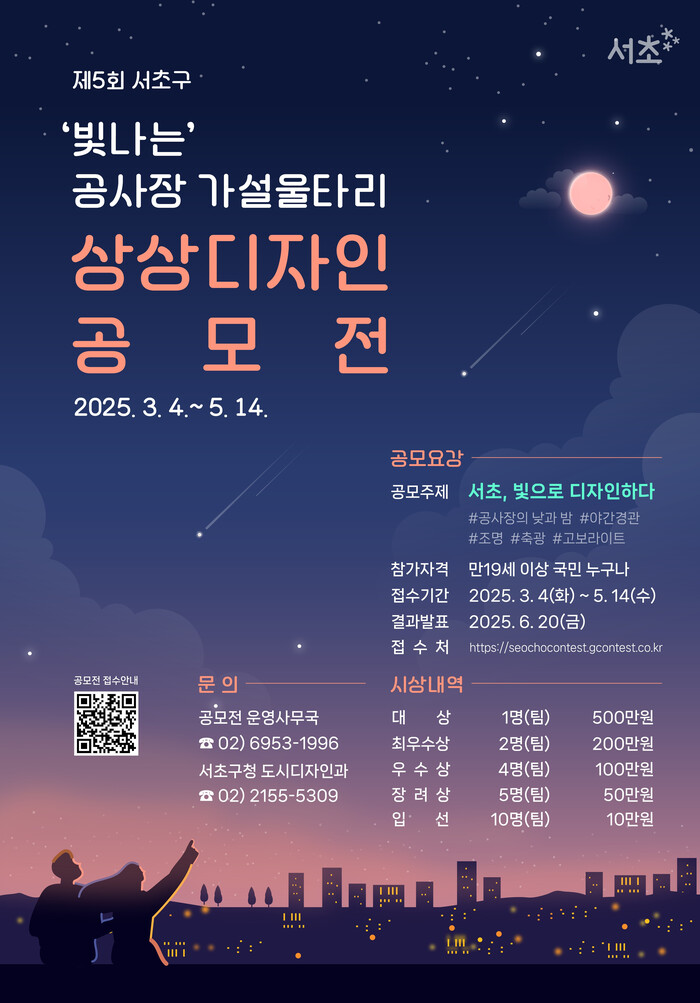 전성수 구청장은 “이번 ‘공사장 가설울타리 공모전’을 통해 주민들의 창의적인 아이디어를 발굴해, 빛과 예술이 어우러진 서초만의 감각적인 도시경관을 조성하겠다”라며 “서초의 곳곳이 안전은 물론, 도심 속 문화와 개성을 담은 매력적인 거리로 거듭날 수 있도록 최선을 다하겠다”고 말했다.
