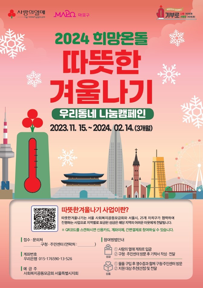 [시민일보 = 홍덕표 기자] 서울 마포구(구청장 박강수)는 어려운 이웃을 위한 ‘2024년 희망온돌 따뜻한 겨울나기 캠페인’을 오는 2024년 2월14일까지 추진한다고 밝혔다.