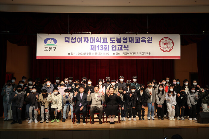 | ▲ 지난 11일 열린 제13회 도봉-덕성 영재교육원 입교식에 참석한 오언석 구청장(앞줄 의자 가운데)이 관계자 및 신입생들과 함께 기념촬영을 하고 있다.(사진=도봉구청 제공) |