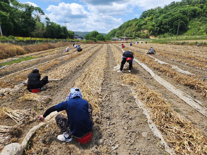 이날 농업정책과 직원 18명과 한국여성농업인 합천연합회 회원 15명은 농작업이 어려운 농가를 지원하기 위해 마늘캐기 작업 등에 일손을 보태며 구슬땀을 흘렸다.