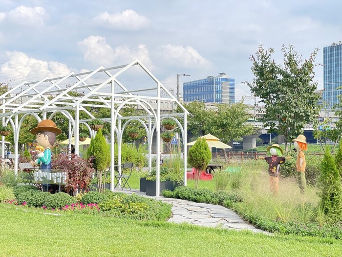 다양한 조형물과 화단으로 조성된 ‘중랑천 피크닉 정원’은 볼거리와 쉼 공간이 조화를 이루는 공간으로 가을을 대표하는 가든멈, 아스타 등 다양한 꽃을 식재하고, 정원사가 가꾼 성동열매마을을 주제로 도토리 등의 조형물을 활용한 이색 공간을 만들었다.