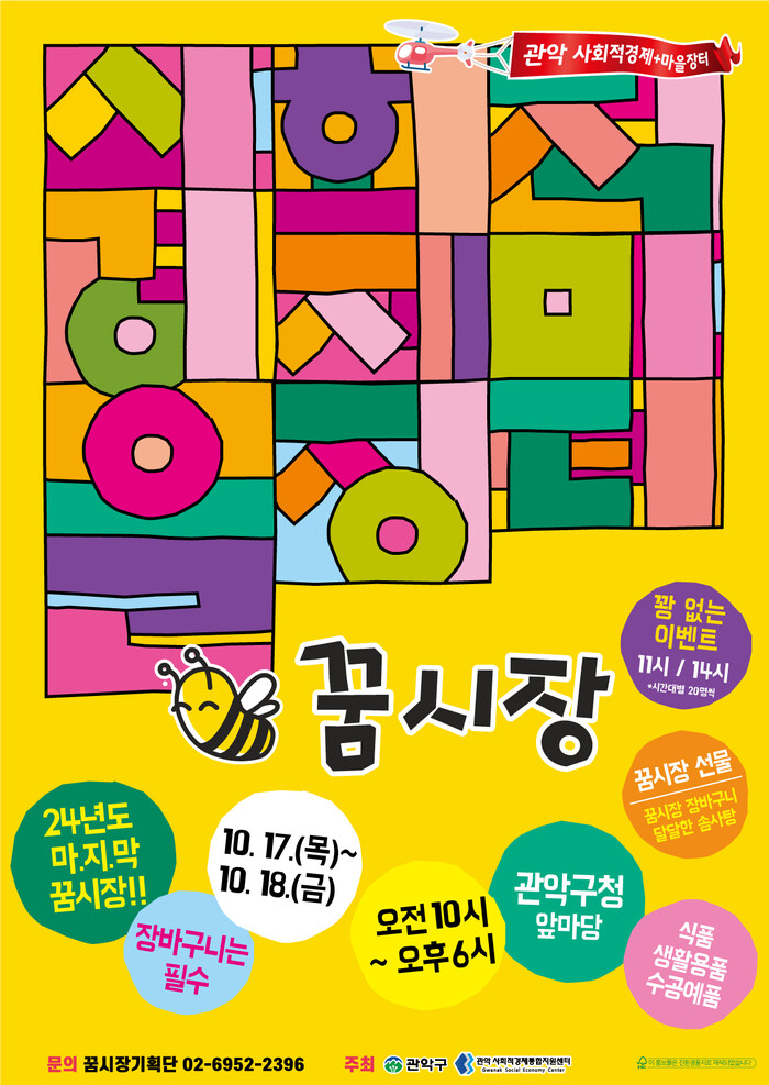 [시민일보 = 문민호 기자] 관악구(구청장 박준희)는 사회적경제 장터인 ‘꿈시장’을 오는 17~18일 개장하고 2024년 장터 일정을 마무리한다.