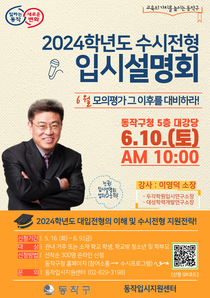 [시민일보 = 여영준 기자] 동작구(구청장 박일하)는 오는 10일 구청 대강당에서 ‘2024학년도 대입을 위한 수시전형 입시설명회’를 개최한다고 밝혔다.