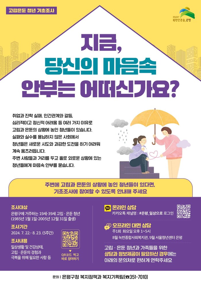 [시민일보 = 이대우 기자] 은평구(구청장 김미경)가 지역내 19~39세 은둔형외톨이 청년 발굴을 위해 기초조사와 온·오프라인 상담을 추진한다.
