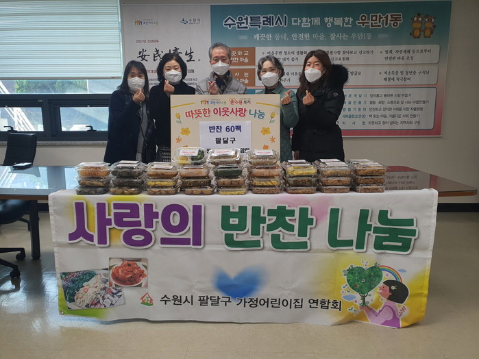 경기 수원시 팔달구 우만1동 행정복지센터는 팔달구 가정 어린이집 연합회로부터 20일 저소득 가구를 위한 반찬 60팩을 전달받았다. 이날 후원된 반찬은 행사 당일 우만1동 지역내 저소득 20가구에 전달됐다. 사진은 전달식에서 관계자들이 기념촬영을 하는 모습. (사진제공=팔달구청)