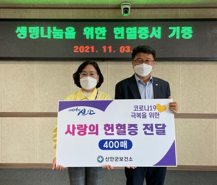 신안군(군수 박우량)은 코로나19 장기화로 인한 혈액수급의 어려움 극복에 동참하고자 헌혈행사를 통해 기증받은 헌혈증서 400매를 대한적십자사 광주전남 혈액원에 기증한다고 밝혔다.