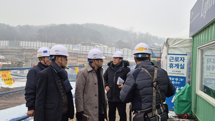 이석범 경기 김포시 부시장이 지속된 대설·한파특보에 따른 대규모 주택건설현장의 안전관리 상태 등을 점검하기 위해 12일 공사 현장을 방문했다. 이번 중점 점검사항은 ▲동절기 콘크리트 타설 등 시공 품질관리 ▲동절기 건설현장 안전수칙 준수 ▲ 화재 및 한랭질환 예방수칙 준수 등이다. 사진은 이 부시장(가운데)이 관계자들과 현장을 살펴보고 있는 모습. (사진=김포시청 제공)