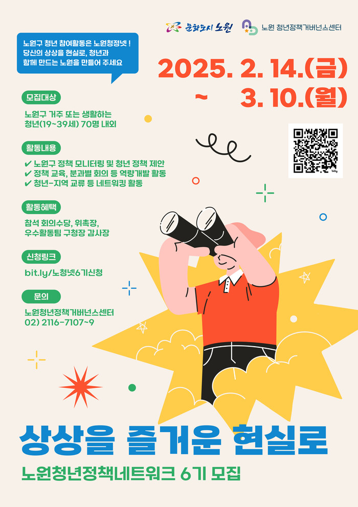 [시민일보 = 박소진 기자] 노원구(구청장 오승록)가 ‘노원청년정책네트워크 6기’ 청년위원을 오는 3월10일까지 모집한다고 밝혔다.