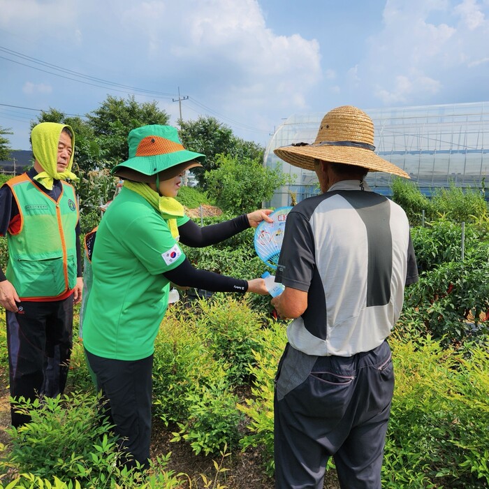 경기 이천시는 지난 5일 시 자율방재단과 폭염 야외작업자 예찰 및 국민행동요령 홍보를 추진해 신둔면 일원의 도암리 인삼밭 등 논·밭, 건설 현장에서 무더위 취약시간에 얼음 생수를 배부하고 폭염 대비 국민행동요령 홍보했다. 사진은 야외작업자에게 얼음 생수와 부채를 전달하고 있는 모습.(사진=이천시청 제공)