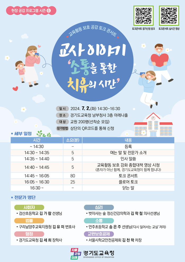 이에 대해 검산초등학교 김가람 교사의 사회로 ▲구리남양주교육지원청 변호사 김유미(법률) ▲언주초등학교 교사 송은주(소통) ▲벗이사는 숲 정신건강의학과 전문의 김학철(심리) ▲서울시학교안전공제회 차장 김천학(교원보호공제) ▲경기도교육청 장학사 김세희(행정)가 각 분야 전문가로 참여한다.