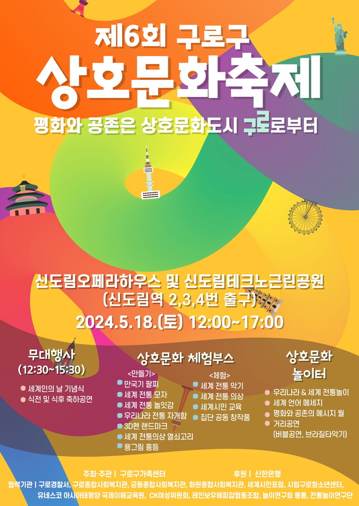 [시민일보 = 이대우 기자] 구로구가족센터가 오는 18일 낮 12시~오후 5시 신도림오페라하우스와 신도림테크노근린공원(신도림역 2, 3, 4번 출구)에서 상호문화축제를 개최한다.