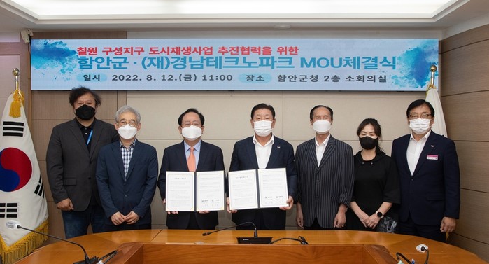 [함안=최성일 기자] 함안군은 12일 오전 11시 함안 군청 2층 소 회의실 에서 (재)경남 테크노 파크와 칠원 구성 지구 도시 재생 사업 추진 협력 MOU 체결식을 개최했다.