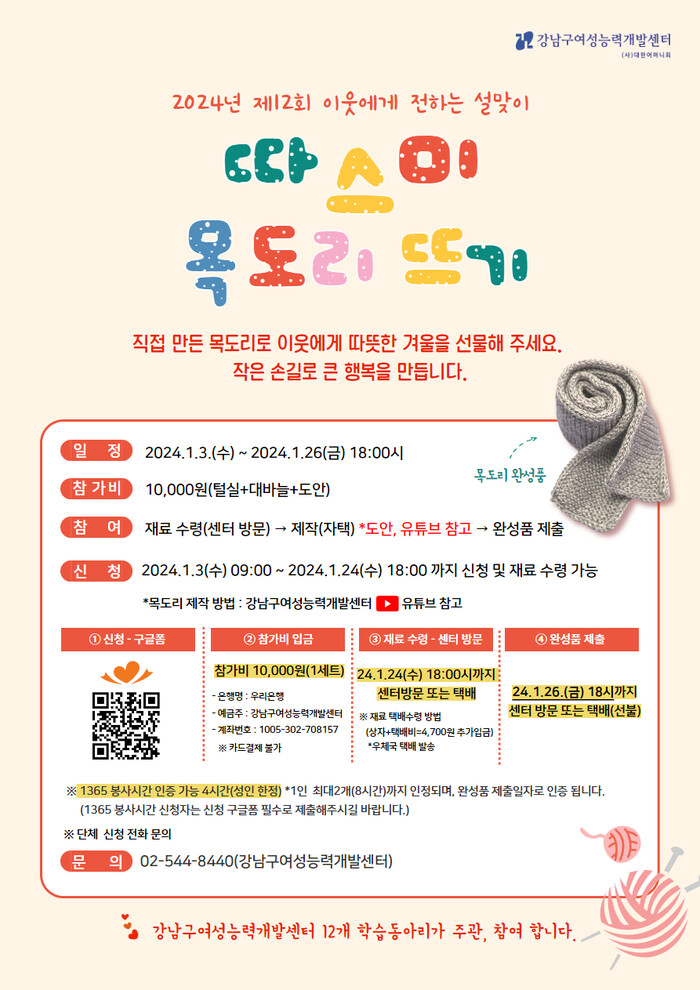 참가를 희망하는 사람은 강남구여성능력개발센터 홈페이지를 통해 신청하면 된다. 참가비는 1만 원이다. 신청을 마치면 센터를 방문하거나 택배를 통해 키트(털실, 대바늘)와 도안을 받게 된다. 초보자는 센터 홈페이지에서 제작해 유튜브에 올린 목도리 뜨기 영상을 참고해 만들 수 있다.