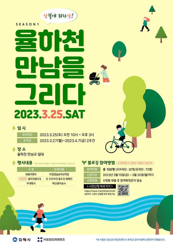 율하천 플로깅 이벤트는 지역주민들의 사전 신청을 받아 오프라인으로 25일 하루, 온라인으로 3월 27일부터 4월 7일까지 2주간 진행될 예정이다.