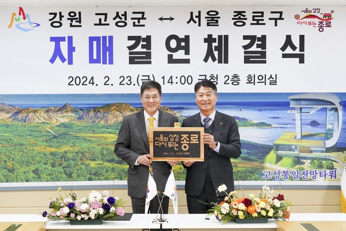 [시민일보 = 이대우 기자] 서울 종로구(구청장 정문헌)가 최근 강원특별자치도 고성군과 ‘자매결연 협약’을 맺었다.