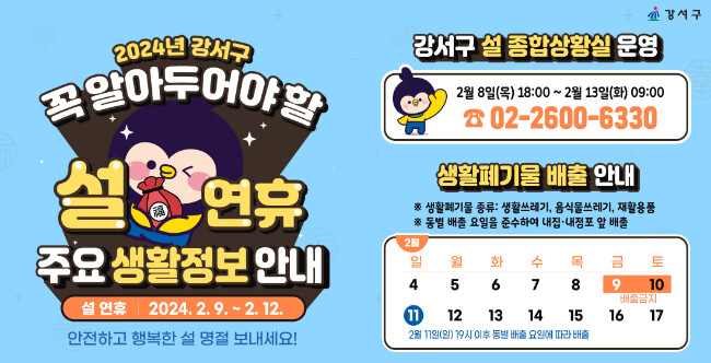 [시민일보 = 홍덕표 기자] 강서구(구청장 진교훈)가 설 명절을 앞두고 주민들이 안전하고 따뜻한 연휴를 보낼 수 있도록 7일부터 오는 13일까지 ‘2024 설 종합대책’을 본격 가동한다.