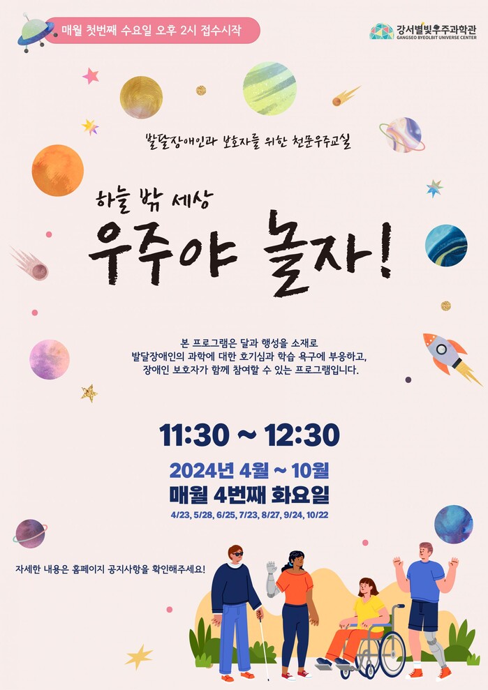 심재현 관장은 “강서별빛우주과학관이 개관한 뒤 장애인이 보호자와 함께 방문하는 것을 보며 이분들을 위한 프로그램을 진행하면 좋겠다는 생각을 했다”며 “특별한 천문우주교실을 준비했으니 발달장애인들과 보호자분들의 많은 관심과 참여를 바란다”라고 말했다.