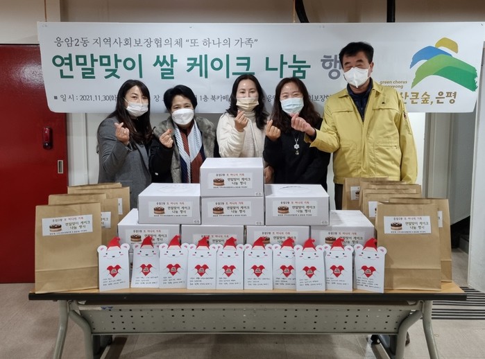 서울 은평구 응암2동 지역사회보장협의체는 연말을 맞이해 최근 코로나19로 바깥 활동이 어려운 저소득 홀몸노인을 대상으로 쌀케이크를 크리스마스 카드와 함께 비대면으로 전달하는 나눔 행사를 진행했다. 사진은 전달식에서 관계자들이 기념촬영을 하는 모습. (사진제공=은평구청)