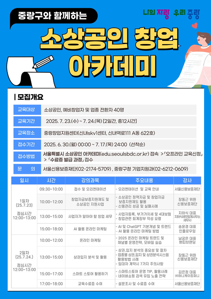 창업아카데미는 오는 23일부터 24일까지 이틀간 중랑창업지원센터에서 진행되며, 서울신용보증재단이 주관한다.