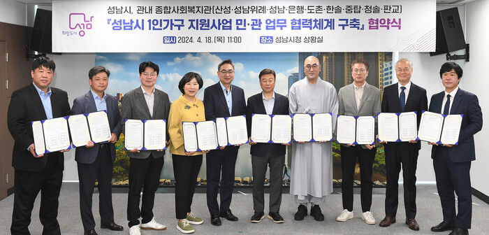 [성남=오왕석 기자] 성남시는 4월 18일 오전 11시 시청 4층 상황실에서 신상진 성남시장과 지역 내 9곳 종합사회복지관장 등이 참석한 가운데 ‘1인 가구 지원사업 민·관 업무 협력체계 구축에 관한 업무협약’을 했다.