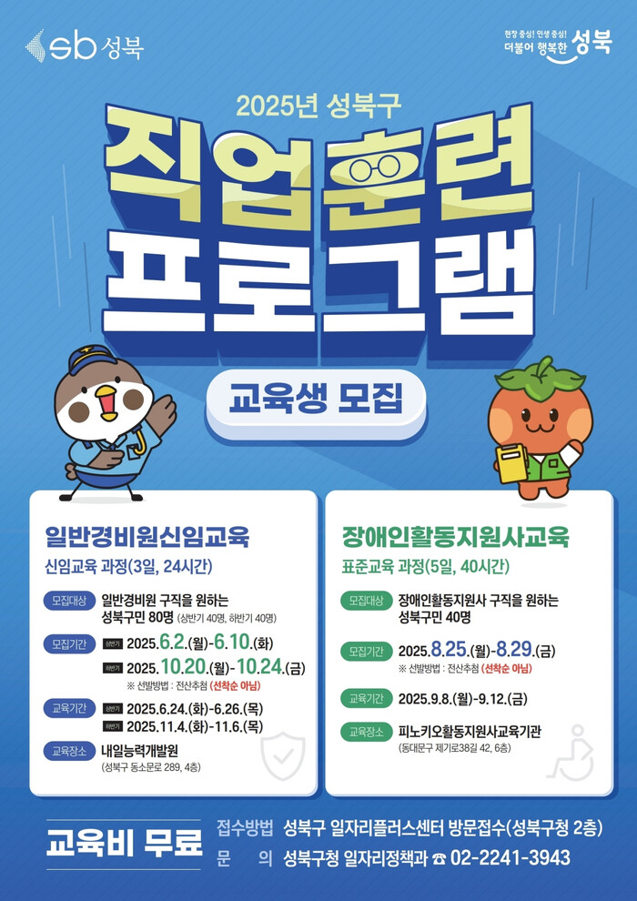 [시민일보 = 문민호 기자] 성북구(구청장 이승로)가 중·장년층 구직자의 수요가 높은 일반경비원 분야의 취업 기회를 넓히기 위해 ‘2025년 상반 과정’을 운영한다.