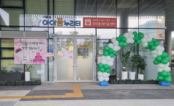 | ▲ 서울숲 아이꿈누리터 개관 1주년 축하 포스터가 붙어있는 센터 입구 모습. 포스터는 서울숲아이꿈누리터 이용 아동의 작품. (사진=성동구청 제공) |