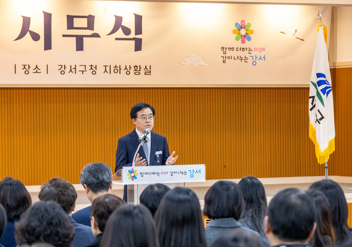 강서구가 최근 구청 지하상황실에서 ‘2025년도 시무식’을 개최했다. 사진은 이날 시무식에 참석한 진교훈 구청장이 인사말을 하고 있는 모습. (사진=강서구청 제공)