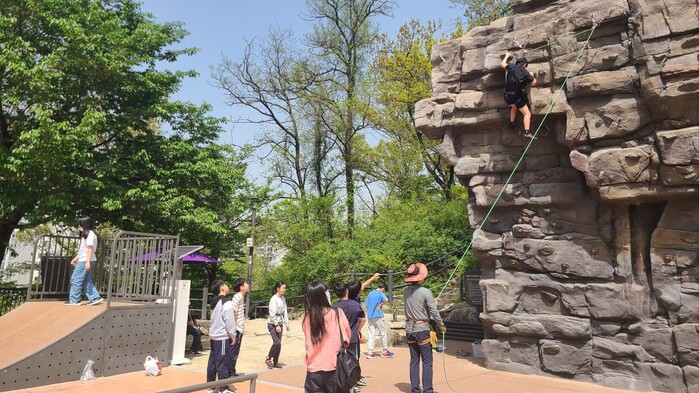 | ▲ 배봉산 인공암벽장에서 암벽등반 체험하는 학생들. (사진=동대문구청 제공) |