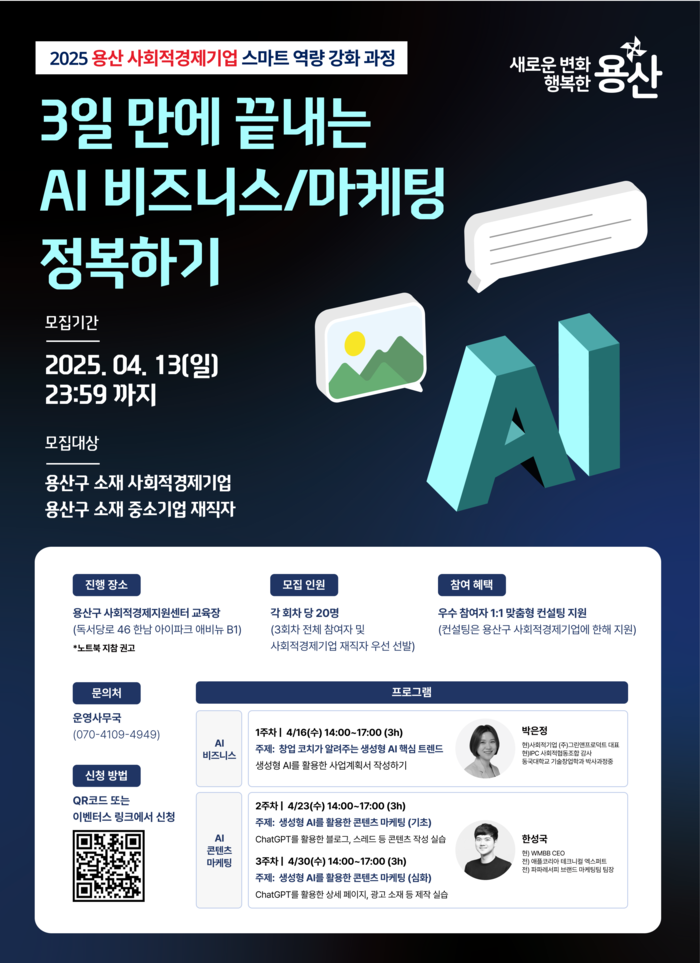 [시민일보 = 문민호 기자] 용산구(구청장 박희영)는 사회적경제기업의 디지털전환을 지원하기 위해 오는 16~30일 총 3회에 걸쳐 ‘3일 만에 끝내는 AI 비즈니스, 마케팅 정복하기’ 교육을 실시한다