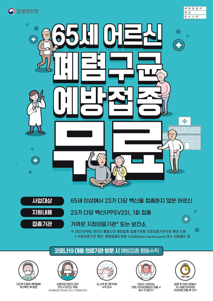 우리나라의 사망원인 중 폐렴은 2020년 3위를 차지할 정도로 사망률이 높으며, 65세 이상 어르신에서 폐렴으로 인한 패혈증, 뇌수막염, 심내막염 등 침습성 폐렴구균 감염증의 발생 빈도가 높고 심할 경우 사망에 이를 수 있다.