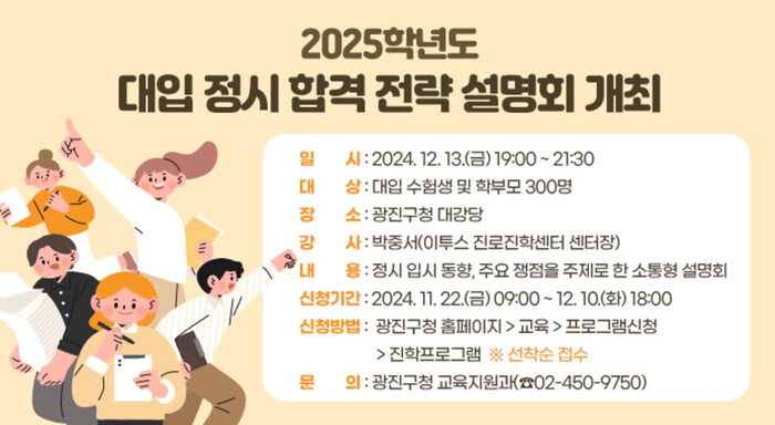 [시민일보 = 여영준 기자] 광진구(구청장 김경호)가 오는 12월13일 구청 대강당에서 ‘2025학년도 대입 정시 합격전략 설명회’를 개최한다.